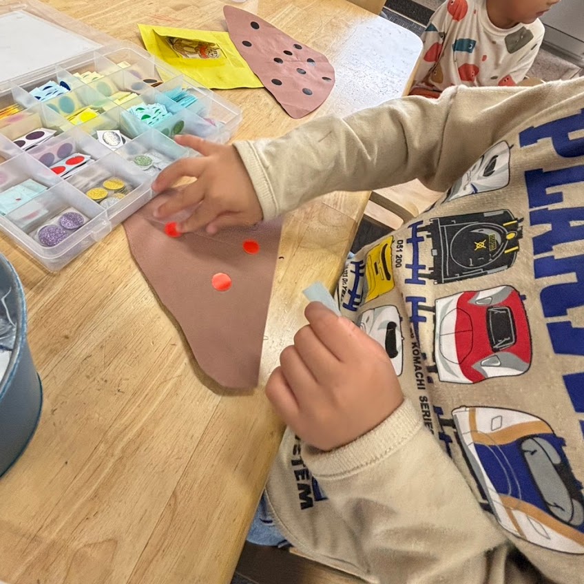 はさみを上手に使って、きのこをチョキチョキ✂シールを貼ったり描いたりしてオリジナルの柄に。動物たちはぬりえにしました。色々な作業工程をみんな集中して楽しんでくれました♬